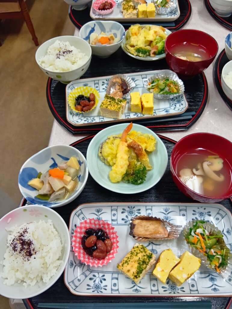 ふっくらとしたご飯に、季節の食材を取り入れた煮物、彩り豊かな副菜、そして揚げたての天ぷらをご用意しました。